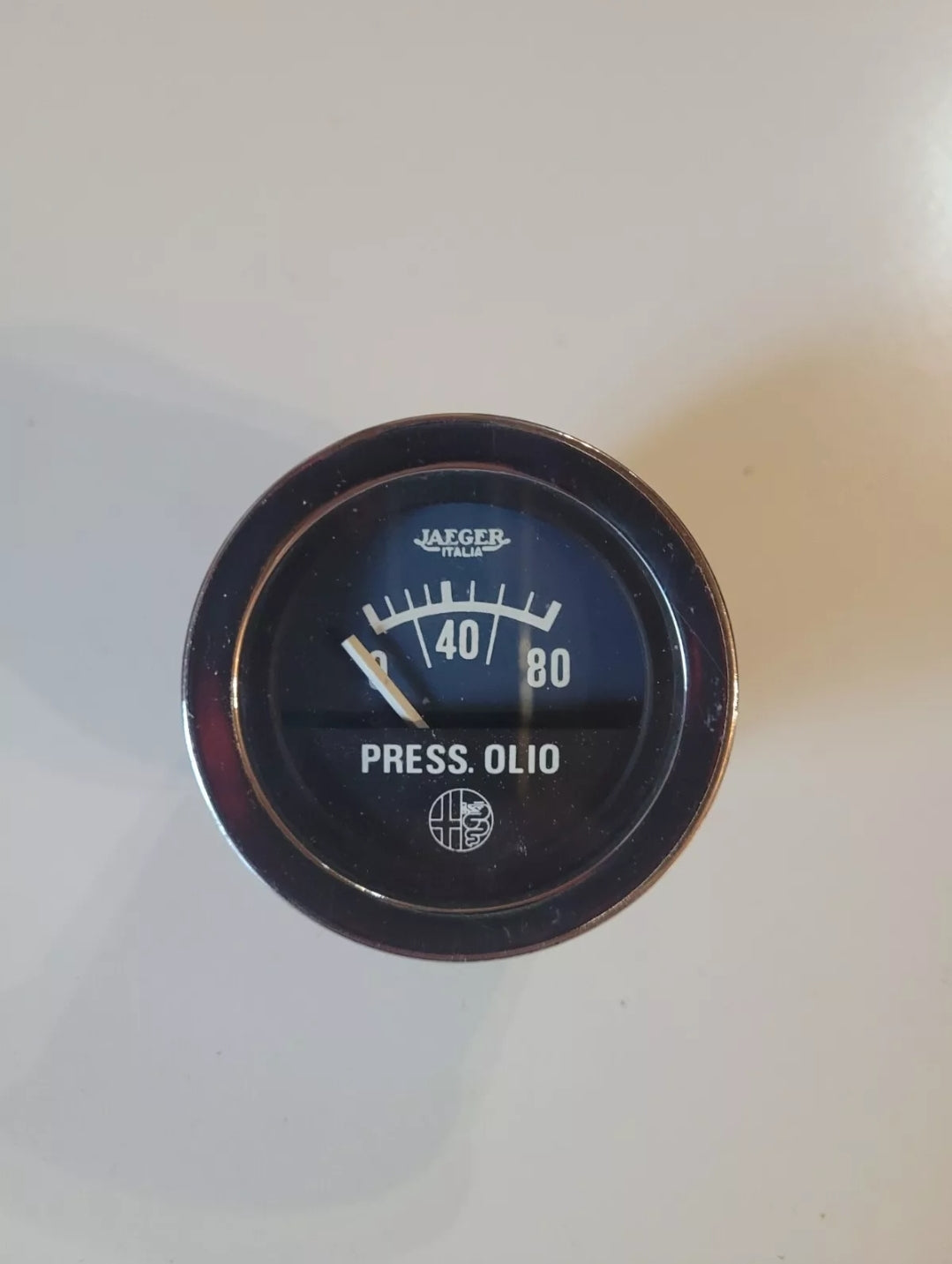 Genuine Jaeger Oil pressure gauge for Alfa Romeo GT Alfetta, featuring its original movement. This manometer is an essential part for maintaining the authenticity of your classic Alfa Romeo.