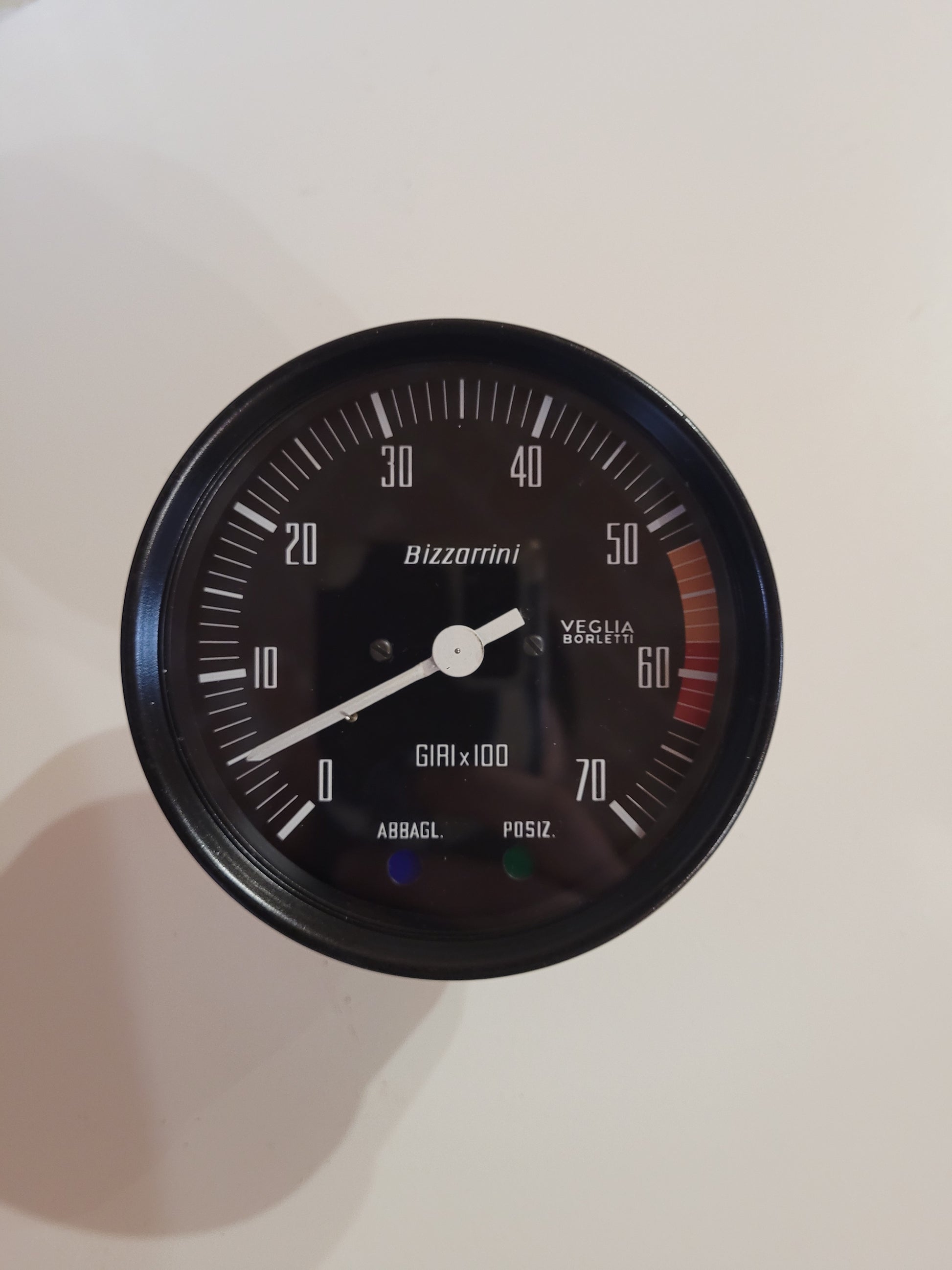 Bizzarrini 5300 GT Tachometer with original Veglia Borletti movement, professionally refurbished. This working gauge ensures precision and reliability, making it an essential piece for collectors and enthusiasts restoring a classic Bizzarrini 5300.