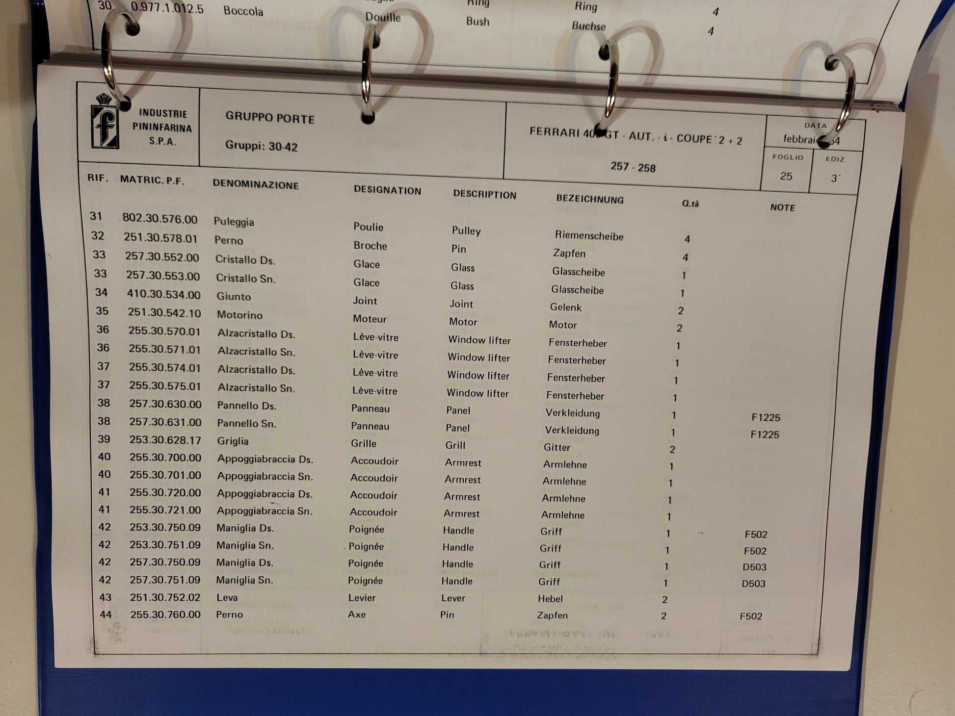 Rare 1976-1985 Ferrari 400/400i Manual body parts, official factory reprint in excellent condition. Contains detailed diagrams and original part numbers—an essential resource for owners, restorers, and collectors. Ideal for restoration projects or as a valuable addition to any Ferrari literature collection.