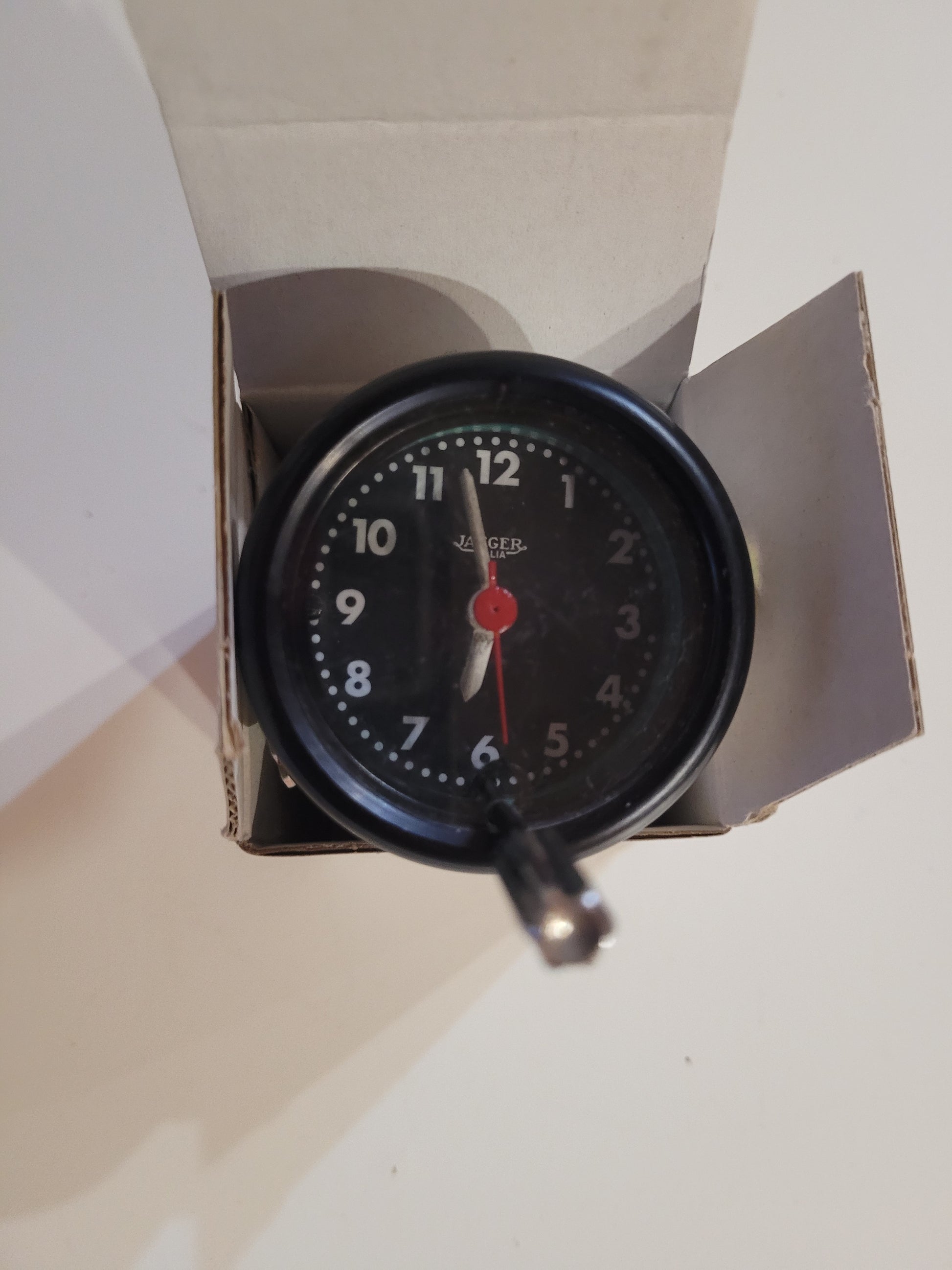 Lamborghini Miura Jaeger clock gauge, professionally refurbished and fully functional. Features the original Jaeger movement, ensuring accuracy and authenticity. Perfect for collectors and enthusiasts completing a period-correct restoration or project car.
