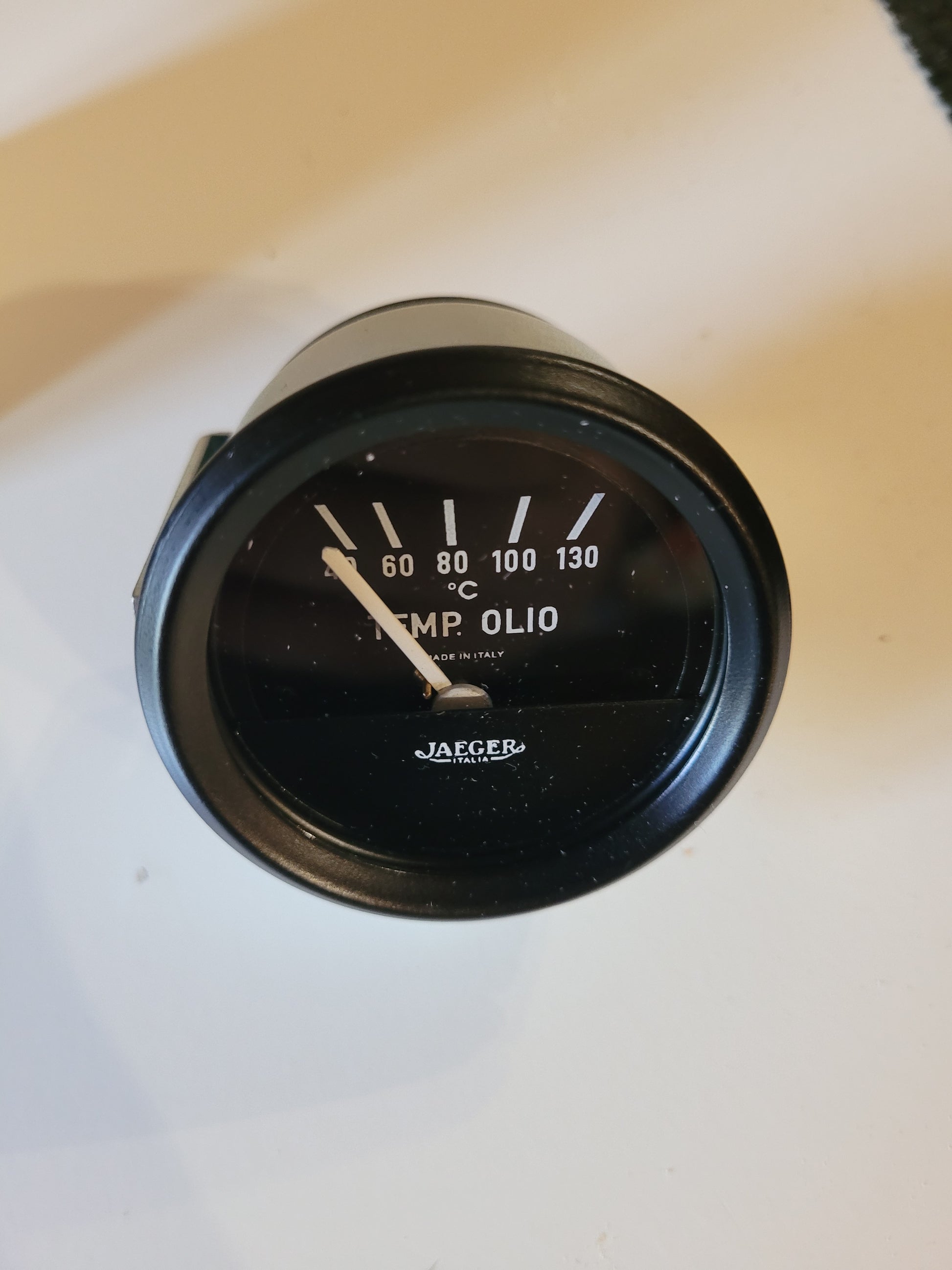 Lamborghini Miura Jaeger oil temperature gauge, professionally refurbished and fully functional. Features the original Jaeger movement, ensuring accuracy and authenticity. Perfect for collectors and enthusiasts completing a period-correct restoration or project car.